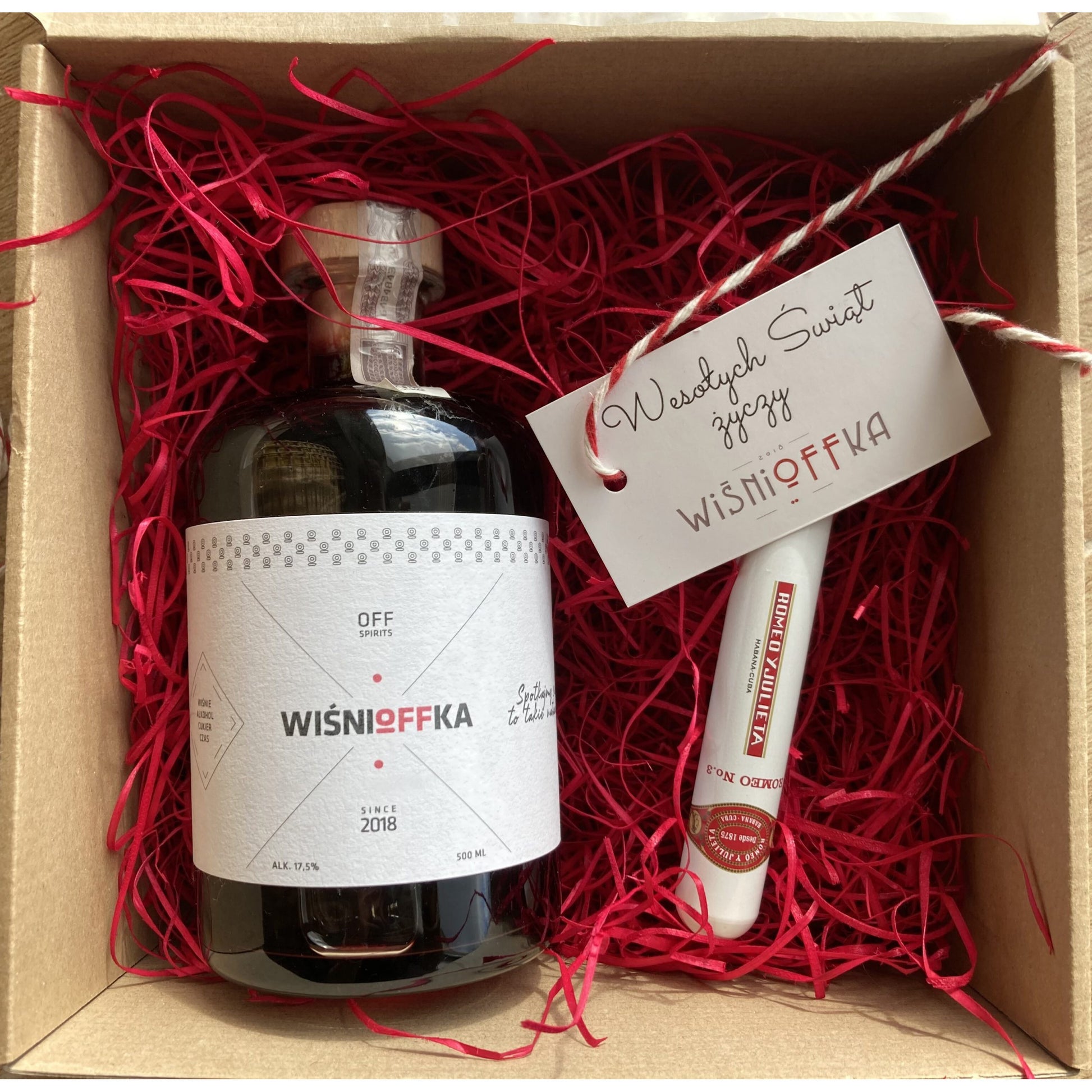 Elegancki zestaw prezentowy nalewka 17,5% dowolny smak oraz jakościowe Kubańskie cygaro, wszystko zapakowane w pudełko.